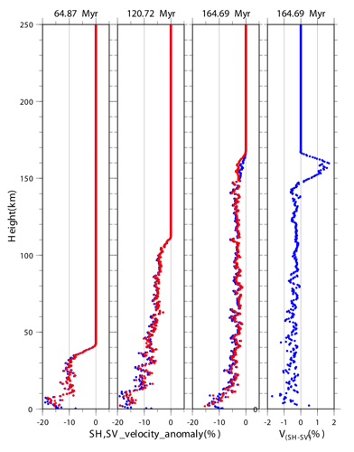 左3つの図は異なる時間におけるS波速度異常を表し,赤がSH波(水平に振動する横波).青がSV波 (垂直に振動する横波) の速度である.右は異方性の大きさである.部分溶融層はメルトの引き延ばしによってラミナ的な構造を持つので,それを垂直に振動させる,あるいは垂直に通り抜ける波は遅くなる.このため,SH波・SV波の速度が異なり,異方性を形成する.また、メルトが大きく引き延ばされる最下部10kmには20%以上の速度低下を持つ超低速度層が形成される.