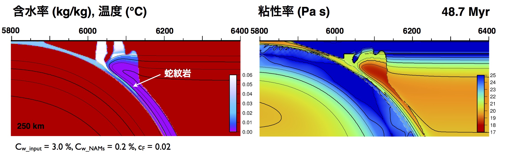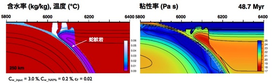 図:沈み込むプレートによる水輸送 左:温度(等高線)と水の含有率(カラー),右:粘性率