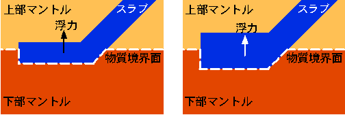 重いスラブが溜まると物質の境界面が押し下げられて浮力を発生します.へこみの質量欠損の量は溜まっているスラブの過剰質量に等しくなっています (アルキメデスの原理).