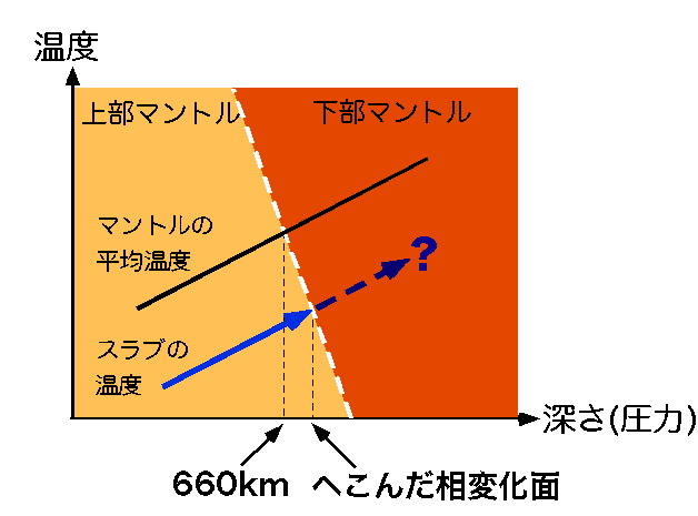 地球内部の圧力は非常に高いので、マントルを構成する鉱物は地表付近と同じ結晶構造では安定せず、より原子の詰まった密な結晶構造に変化します。マントルを構成するかんらん岩は、おおざっぱに見て、約6割がかんらん石、約4割が輝石という鉱物から出来ています。このうち、かんらん石は410km、520km、660kmの圧力で相変化の起こしています。中でも、660km境界がマントル対流に最も重要な影響を与えます。この図はある温度と圧力に対して、上部マントルの鉱物となるか、下部マントルの鉱物になるか、模式図を表しています。660km相変化のみを書いています。このとき、境界の傾きが右下がり、つまり勾配が負になっていることに注意してください。このことから、温度が低いほど高圧側に相変化の境界が移動します。よって、マントルの平均温度(実線)よりも冷たいスラブ(点線)が衝突すると、境界がへこみます。へこんだところは、へこんでいない周囲より密度が低く軽いので、浮力を発生します。また、410kmと520kmの境界は右上がり(勾配が正)になりますので、低温ほど相変化面が上に持ち上がります。このため、スラブを下に引き込む力としてはたらき、沈み込みを妨げません。