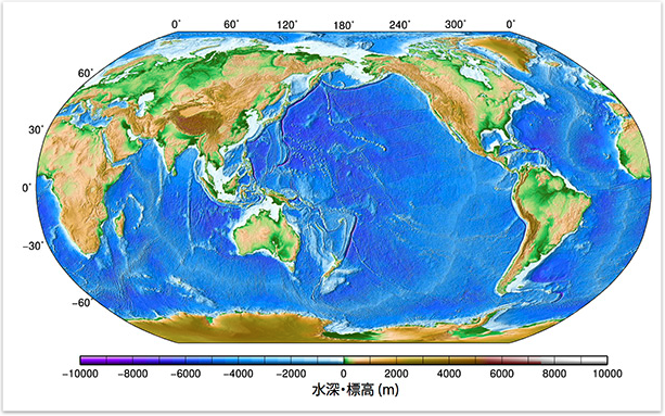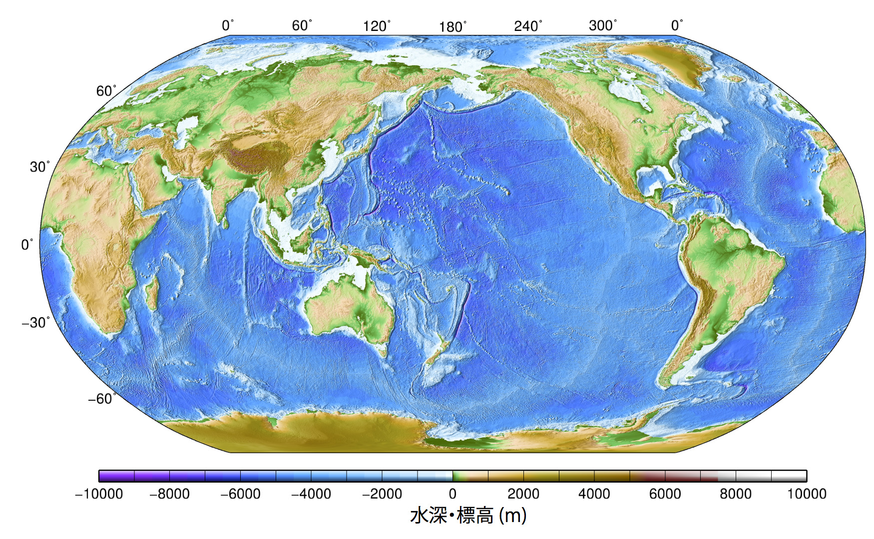 )を使用.ただし、南極大陸やグリーンランドなど氷床のある場所は岩石の地面ではなく,氷床の標高である.