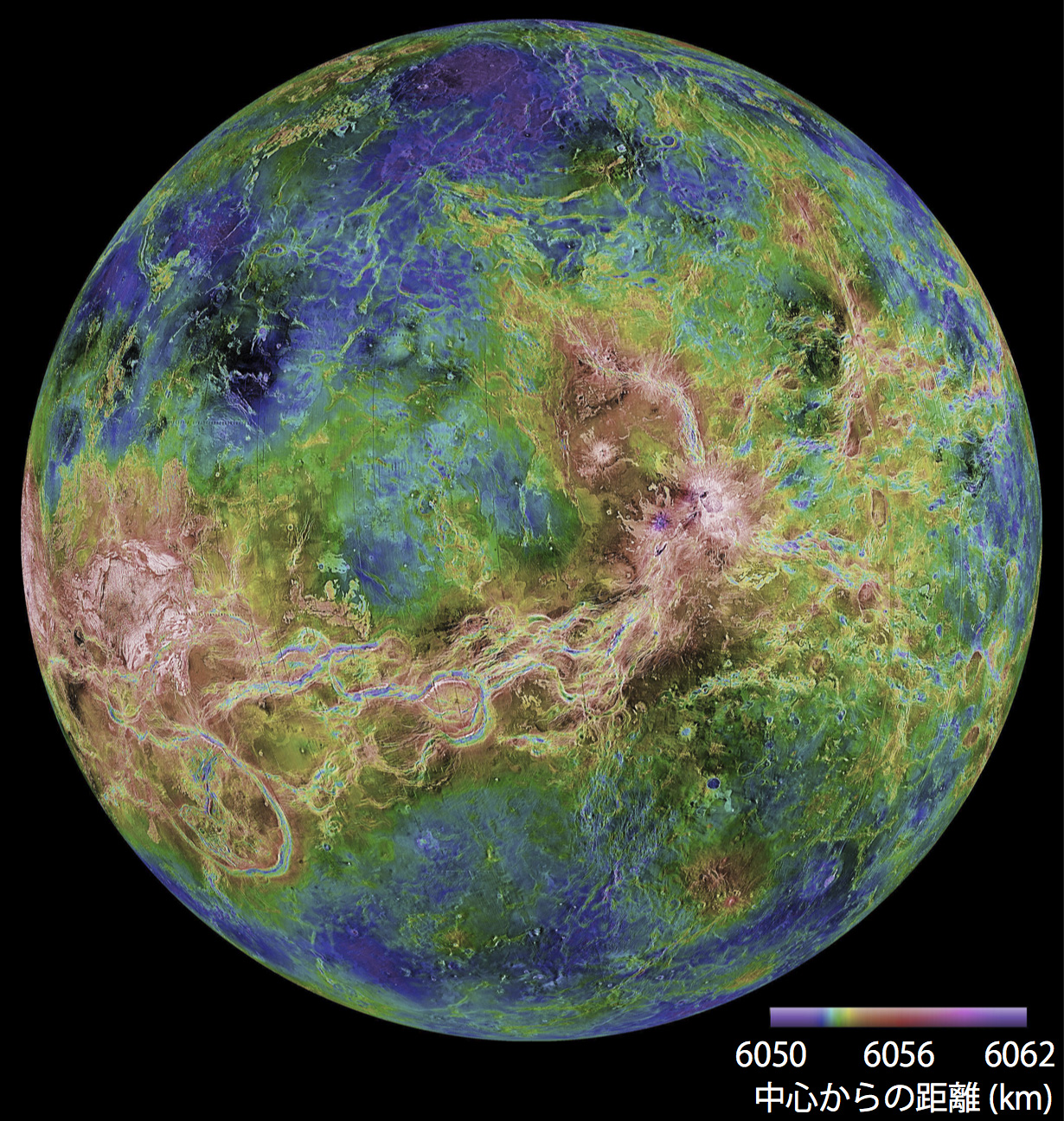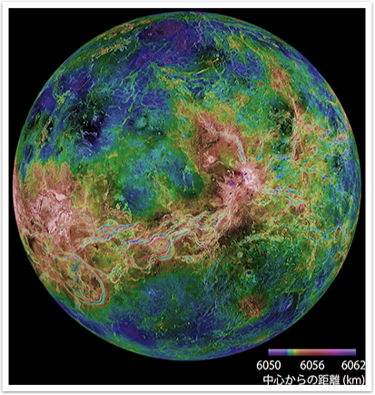 (注20) 惑星探査機マゼランのレーダー観測により得られた.色は金星の中心からの距離を表す.金星の平均半径は6052 kmである.画像はNASA(アメリカ航空宇宙局)による (