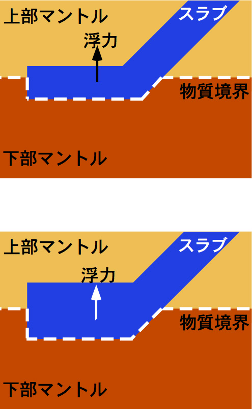 のようになっているということである.地球の層構造を説明したときに,深さ660 kmには地震波速度が不連続に増えるところがある,という話をした.ここでは,密度も8%くらい増加している.スラブは,温度が低いことで上部マントルより2から3%くらい密度が高くなっているので,スラブと周囲のマントルの関係は,ちょうど上の不等式のようになっているのである.ところで,これだとスラブは下部マントルへは沈んでいけないのではないだろうか?地震波トモグラフィーの画像では,下部マントルへ落ちていったように見えていたではないだろうか?もしも,密度差を生じる原因が,上部マントルと下部マントルが別々の物質で出来ていることにあるとすれば,この通りになる.