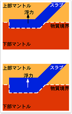 図7: 沈み込むスラブが物質境界に衝突した際に起きる相互作用