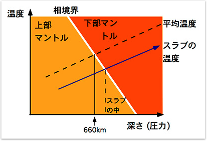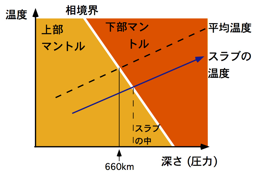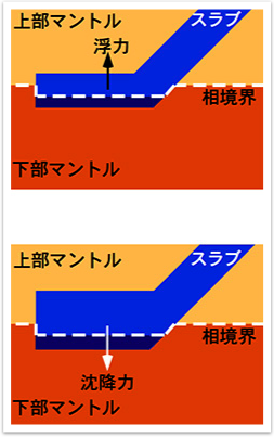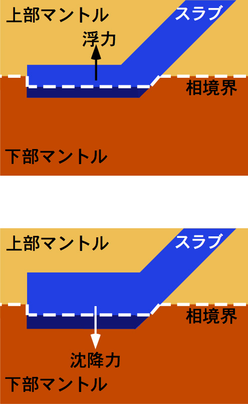 と呼ぶ.冷たいスラブが相境界にぶつかると,相境界が下に凹むのである.相境界の凹みの量はクラペイロン勾配と温度差の積に比例する.これによって,